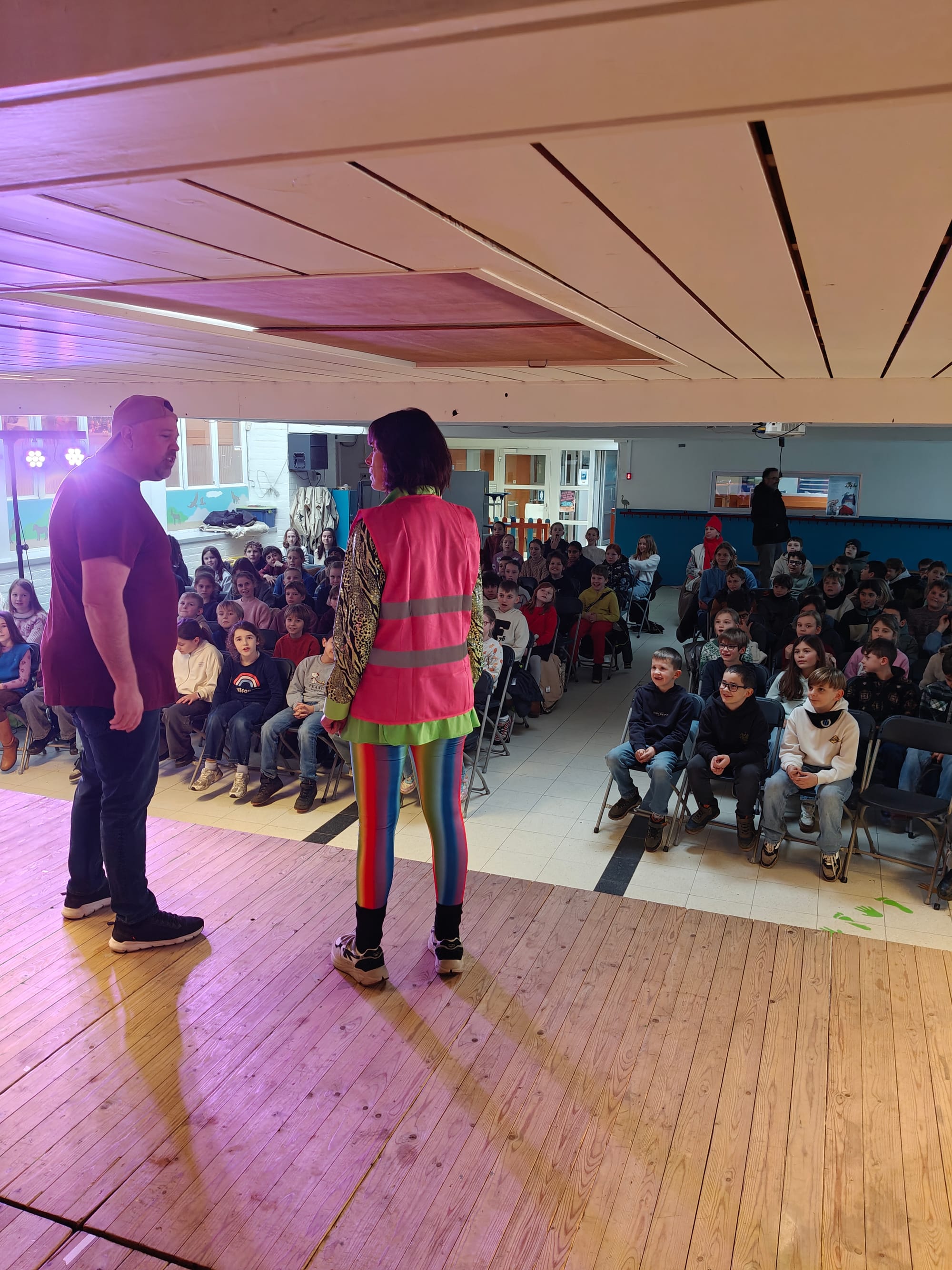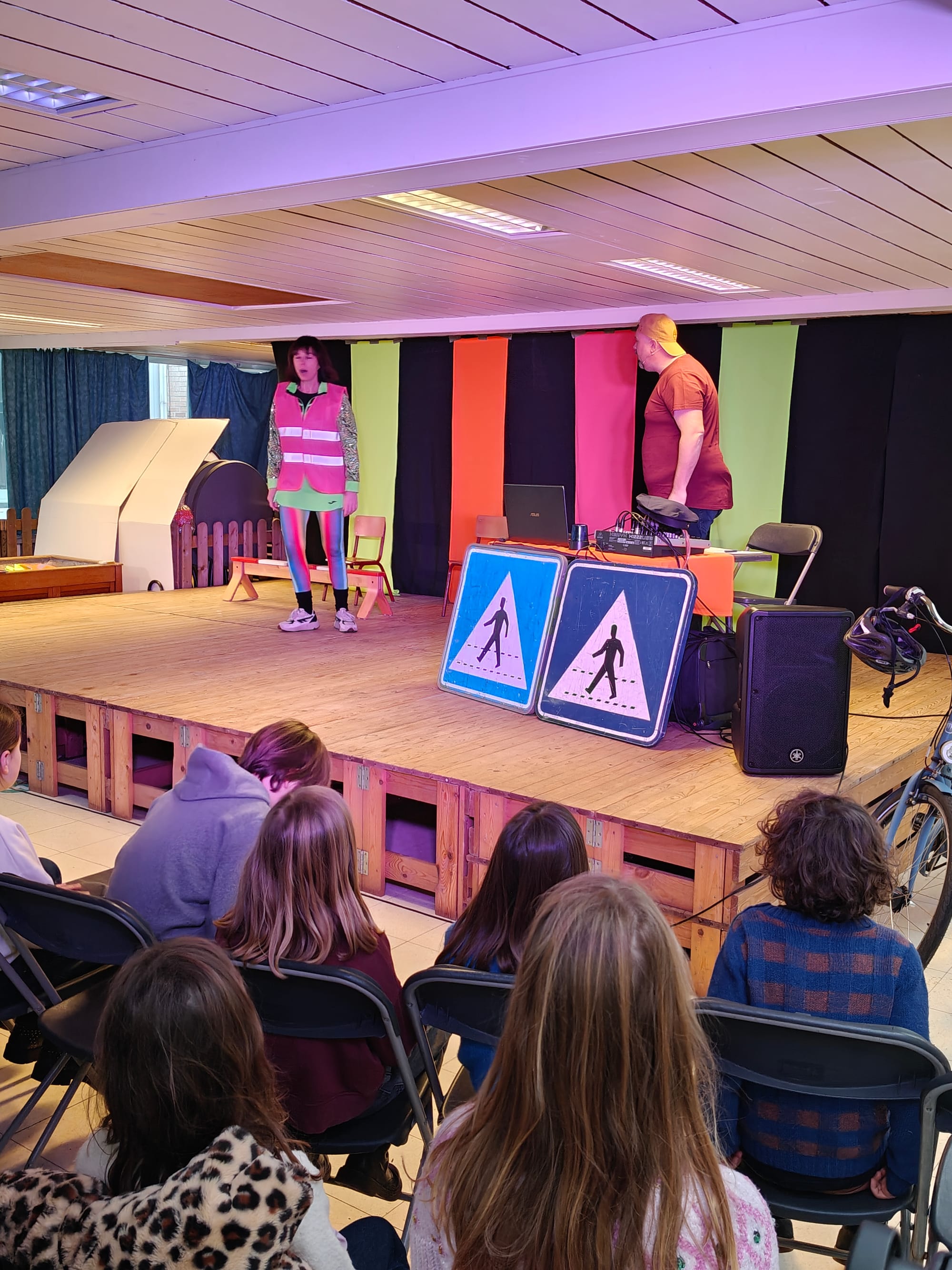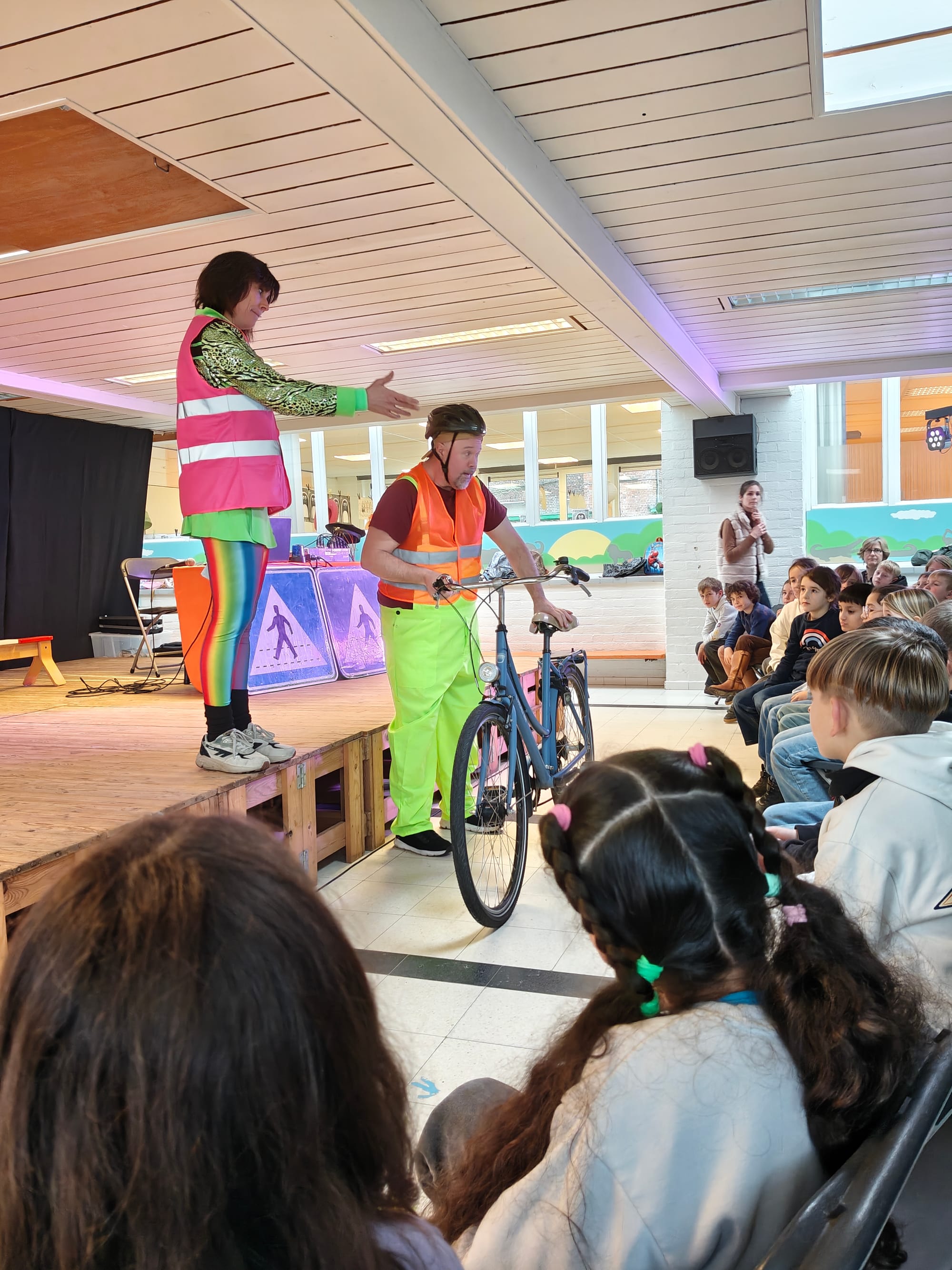 Dankzij de verkeerssubsidie van de stad Brugge konden we 'Duo Fluo' uitnodigen. Een komisch duo dat de kinderen van L3-L6 informeert over het belang van fluo en verkeersveiligheid.