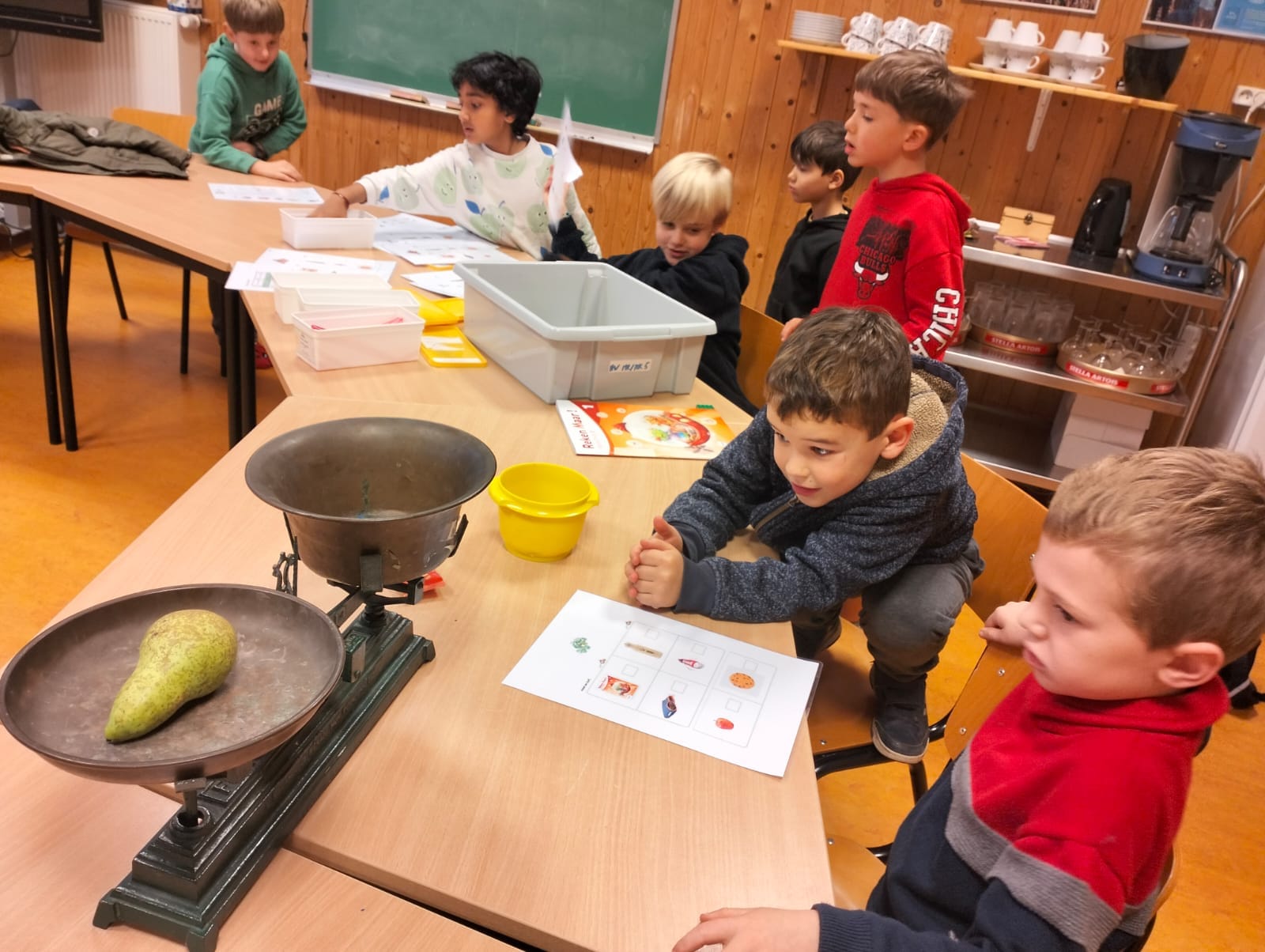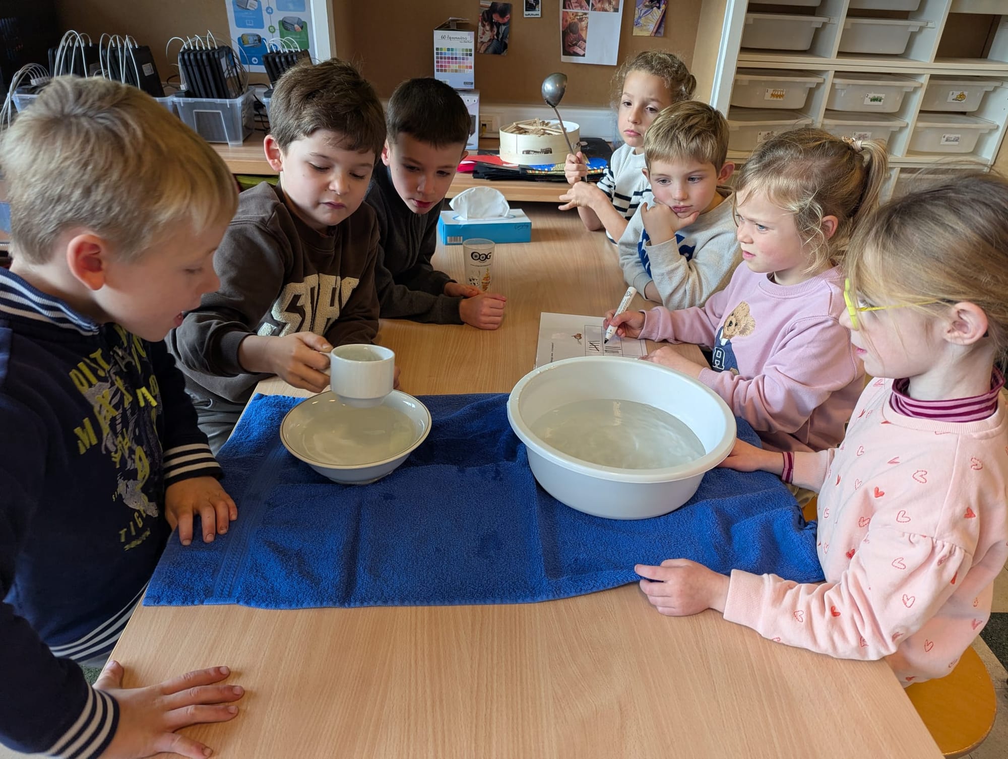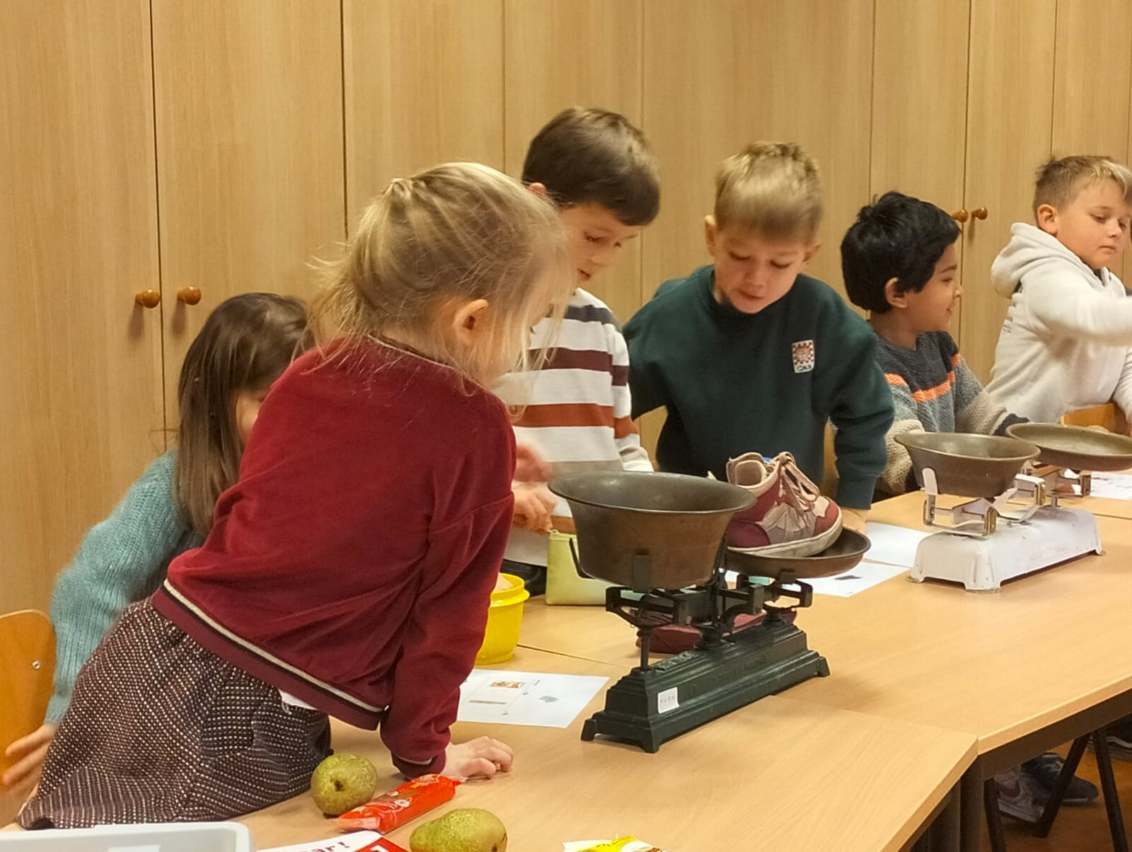 De leerlingen van L1 verzamelden meetlaten, weegschalen, flesjes en potten om op een proefondervindelijke manier op ontdekking te gaan.